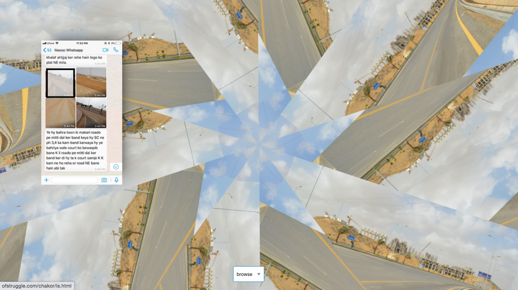 Me and Zahra’s early video work Jinnah Avenue (2017) and our net-art project ofstruggle.com (2018) sought to document and witness these processes as they were unfolding in the neighbourhood of Gadap: where a mega real-estate project was unleashing immense violence. As visual artists, we were reflecting on how to reckon with this visual legacy and with the task of seeing. We were also trying to learn, explore, and experiment with counter-visualities and alternate modes and methods of representing landscapes.
