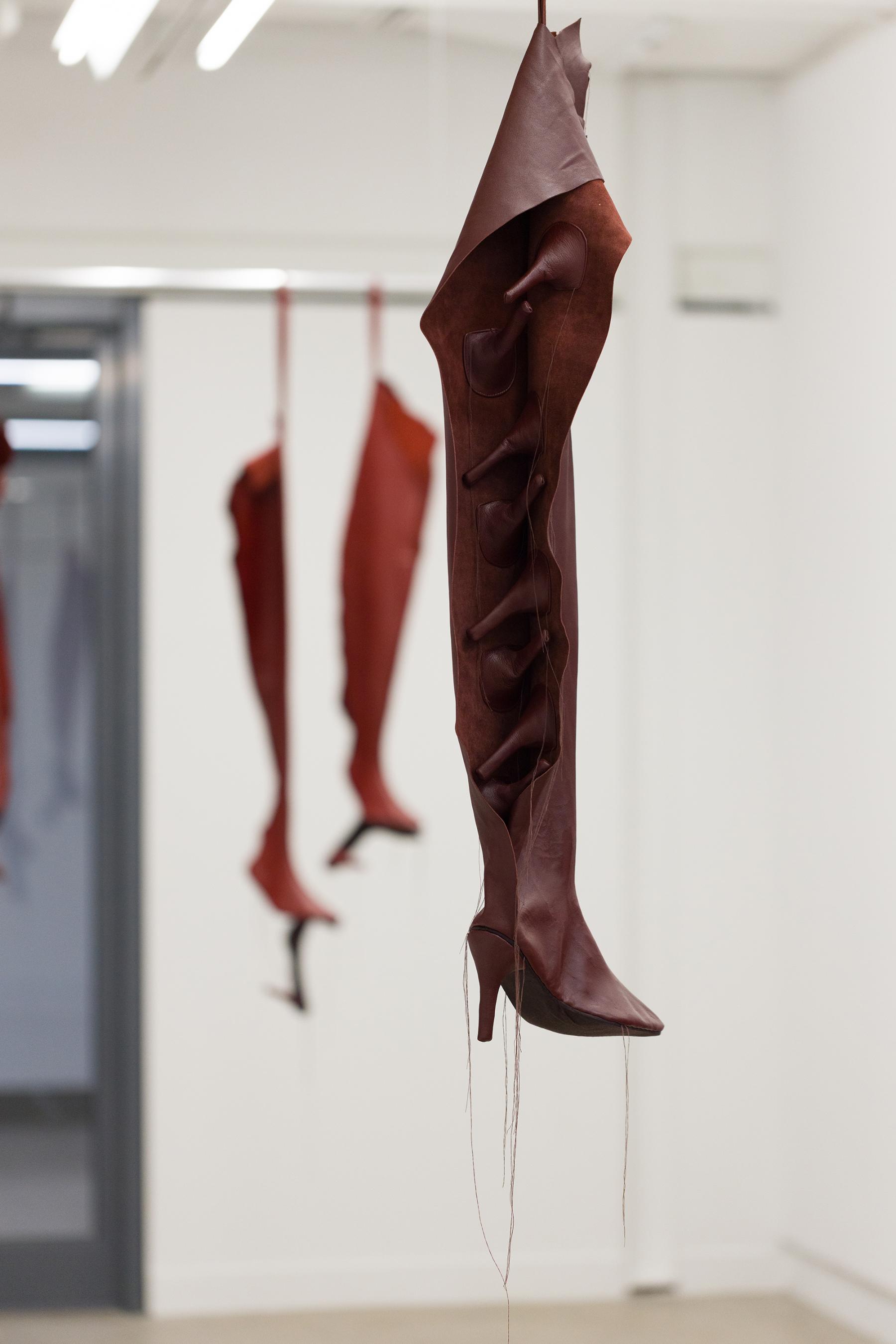 Suspended on their racks, the boots withhold this offer to step in. Their wide shafts gape open in uncut leather, retaining a fleshiness not yet obscured by clean stitching. One piece, a boot in burgundy leather, splits all the way down its shaft and hangs ajar, revealing a spinal column of stiletto heels protruding from its interior. This boot is a body, fortified by heel vertebrae of leather stuffed firm with horse hair. The spine signals strength and capacity to stretch, a series of bones in relation with muscles and ligaments. The spine, whose name comes from the botanical word also meaning ‘thorn,’ as in the spines of a cactus, signals threat. The spine may be a weapon, a protective apparatus. Shoes derive fully from a protective impulse—at some point, primates descended from the arboreal realm and our feet touched the sharp, hot earth. Shoes invoke a threshold, this risk-laden boundary of person and world, me and not-me. The foot, too, inhabits this crossing—the appendage is taboo; arousing and disgusting. The hands made the shoe to sequester the foot, guarded (or withheld) from the threat (or promise) of the wild ground.