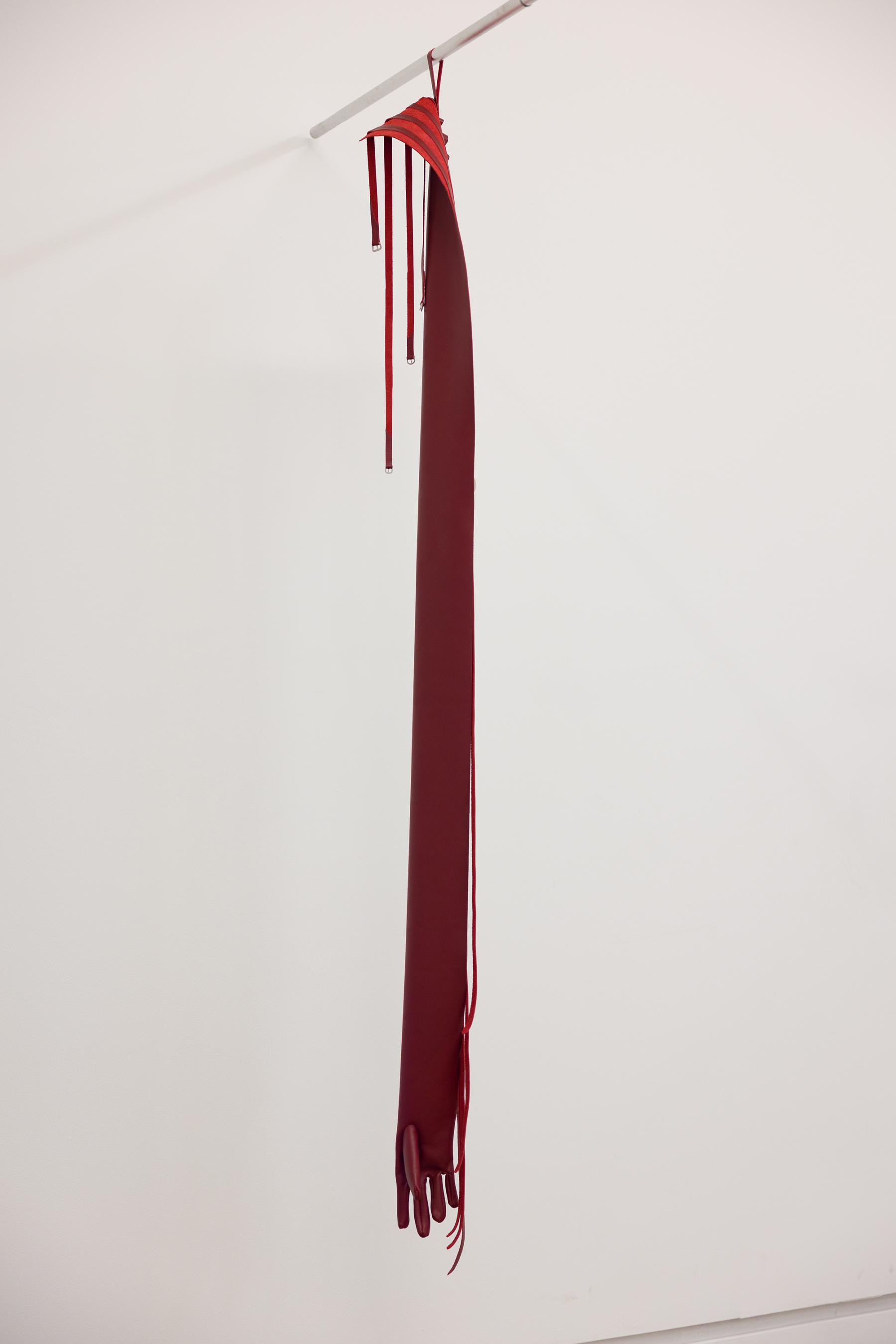 An inventory of garments made and remade, Split Hairs is the back of a shop, strung up with unfinished works, and an archive. It sprawls multiple pasts, residuary presents, and imagined futures—an index of indistinct time. The materials—cowhide leathers, silk taffeta, horsehair—bear their own lifespans, narratives outstretched and stained by time’s passage. Left undone, the absent referent is stitched to the present. The works reconfigure actual/imagined or prior/future bodies, in resonance with drag artist Fayette Hauser’s practice, where “shredded red velvet upholstery layered against an ochre gold tablecloth came not only to signify but to potentially reorder her own blood and flesh.”2