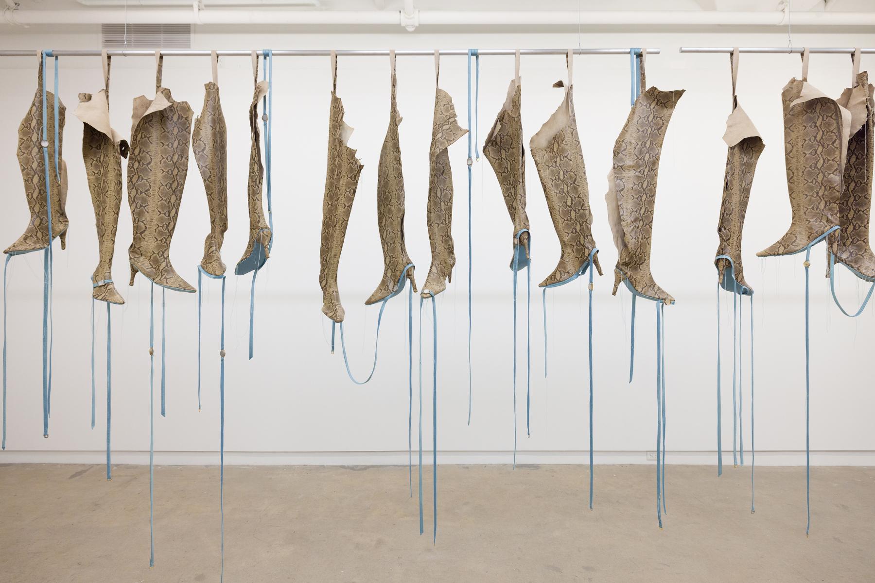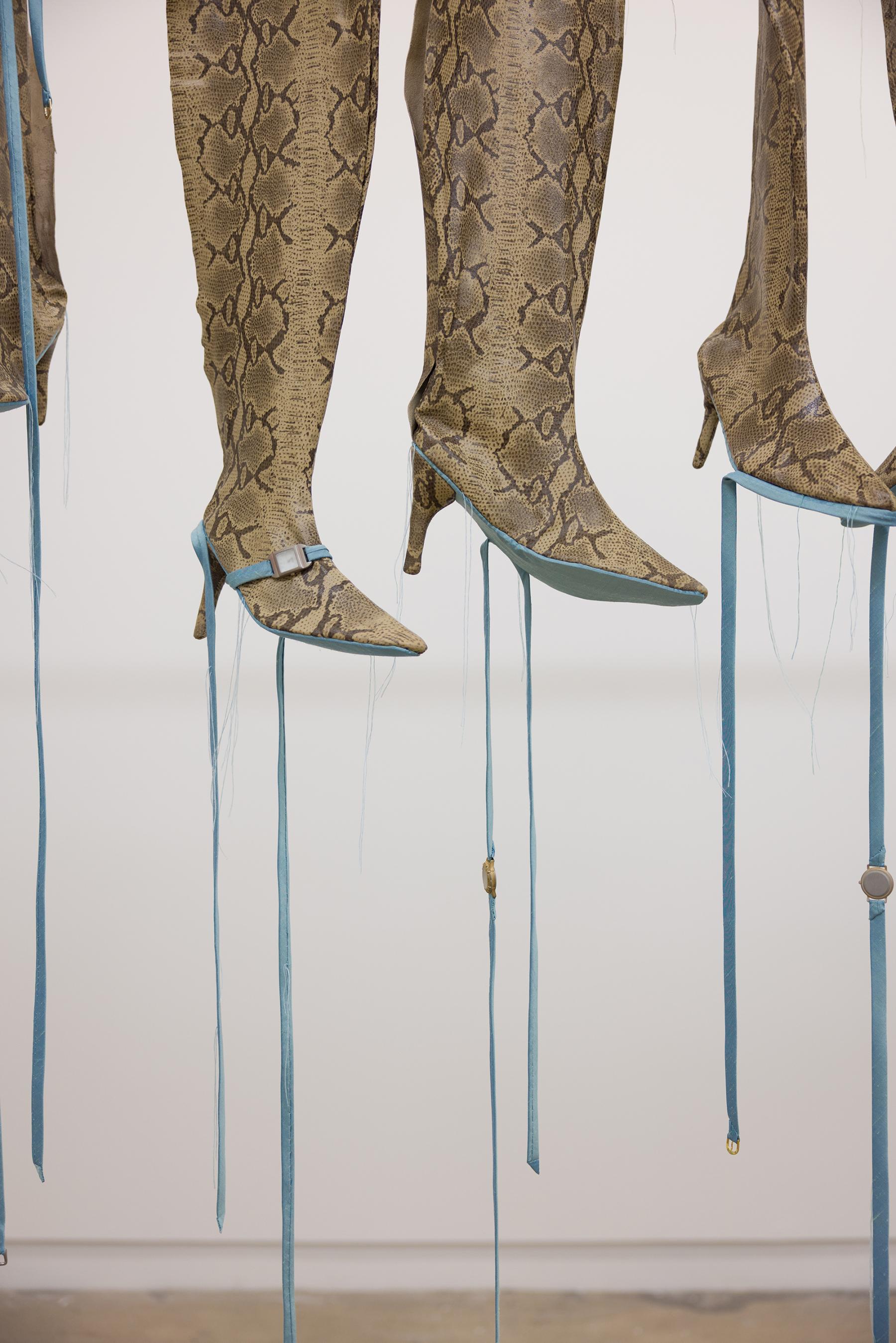 To my left, boots of deep purple leather drip with scissors and loose threads, punctuated by three jackets sewn shut. To my right, a line of snakeskin boots with turquoise soles and dangling watches. The matter of handicraft—thimbles, scissors, thread—is taken up as adornment, but produces instead a set of signs that point to the hands (the past hands that handled the work) as the sculptures themselves point to the feet (the invocation of future feet). Time spreads out as the hanging beings encircle me, winding and unwinding on their poles, drawing little loops in air, and I am urged to go around again, to make some sense of their arrangement.