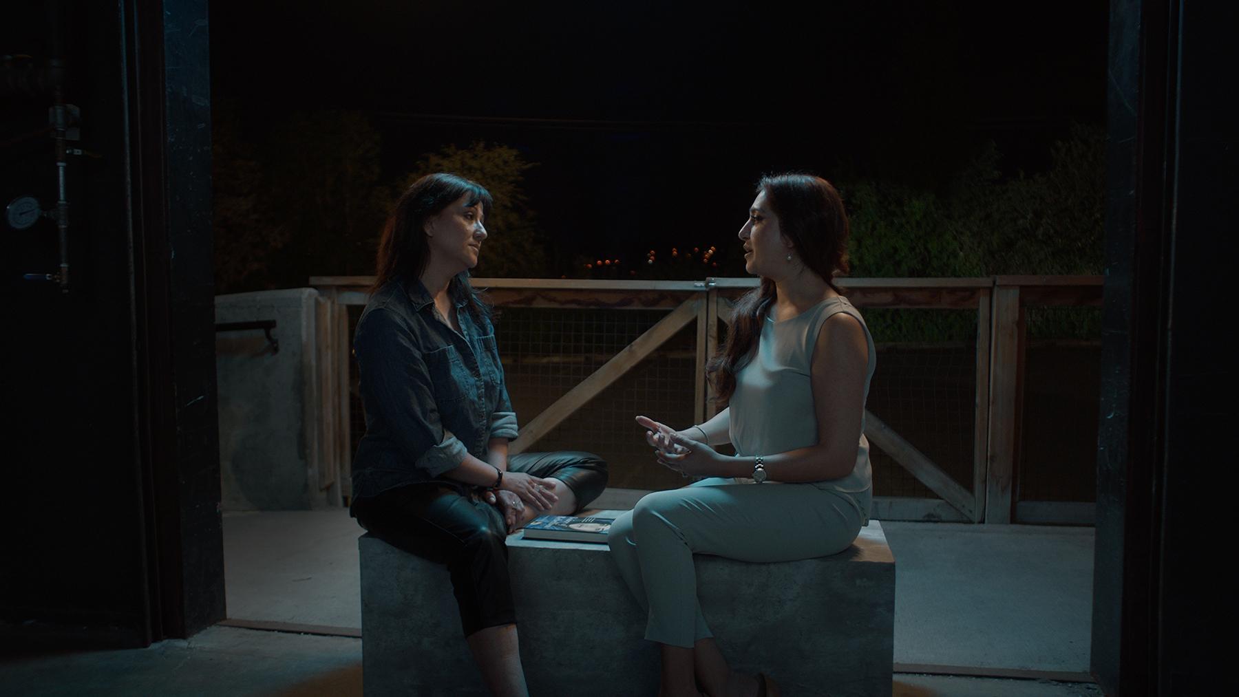 Each interview occurs in a completely different “room,” meant to invoke each woman’s personality and story. In the first interview, Pazira-Fisk walks a red carpet, evoking her experience at the world premiere of Safar-e Ghandehar at Cannes Film Festival in 2001, a film that received widespread attention after September 11. A young Ahmed, riddled with shame about her identity, watched in awe as Pazira-Fisk represented Afghan women on the world stage while touring the film to 22 different film festivals wearing the same red dress each time as a form of protest. “I wanted each woman to be represented through their energy, their persona, who they are; that’s why each room has a different look and feel and energy to it,” Ahmed says.