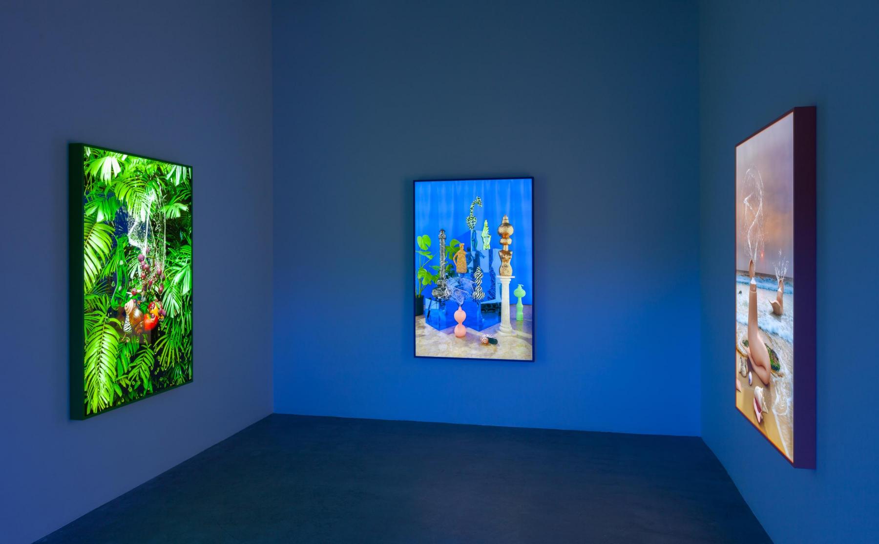 lighting gels and spring clamps, 3D animation, inkjet prints on backlit film, lightboxes, found objects.