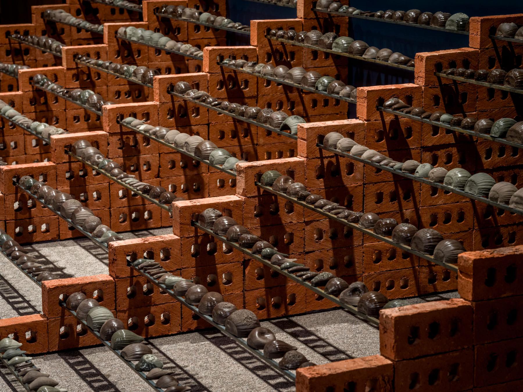 Sameer Farooq, Ascension (Onions), 2022 (detail). Fired ceramic, mason stain, bricks, steel poles. Courtesy of the artist. Photo: Paul Litherland.
