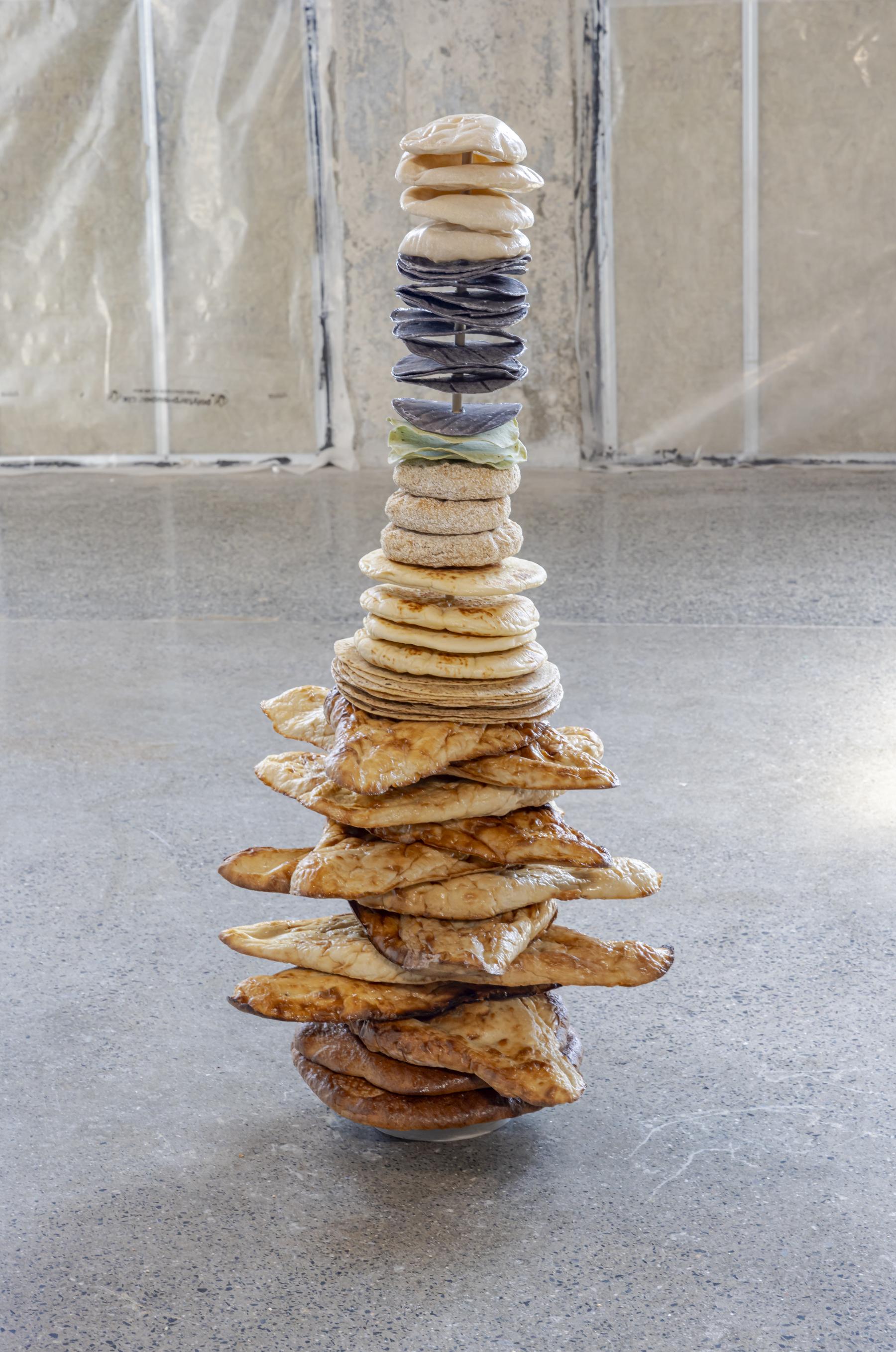 Moving away from the work in the touring exhibition, I also wanted to talk to you about Flatbread Library (2024) which was exhibited at the Museum of Contemporary Art during the 2024 Toronto Biennial of Art. What first drew you to explore flatbread as a subject and material?
