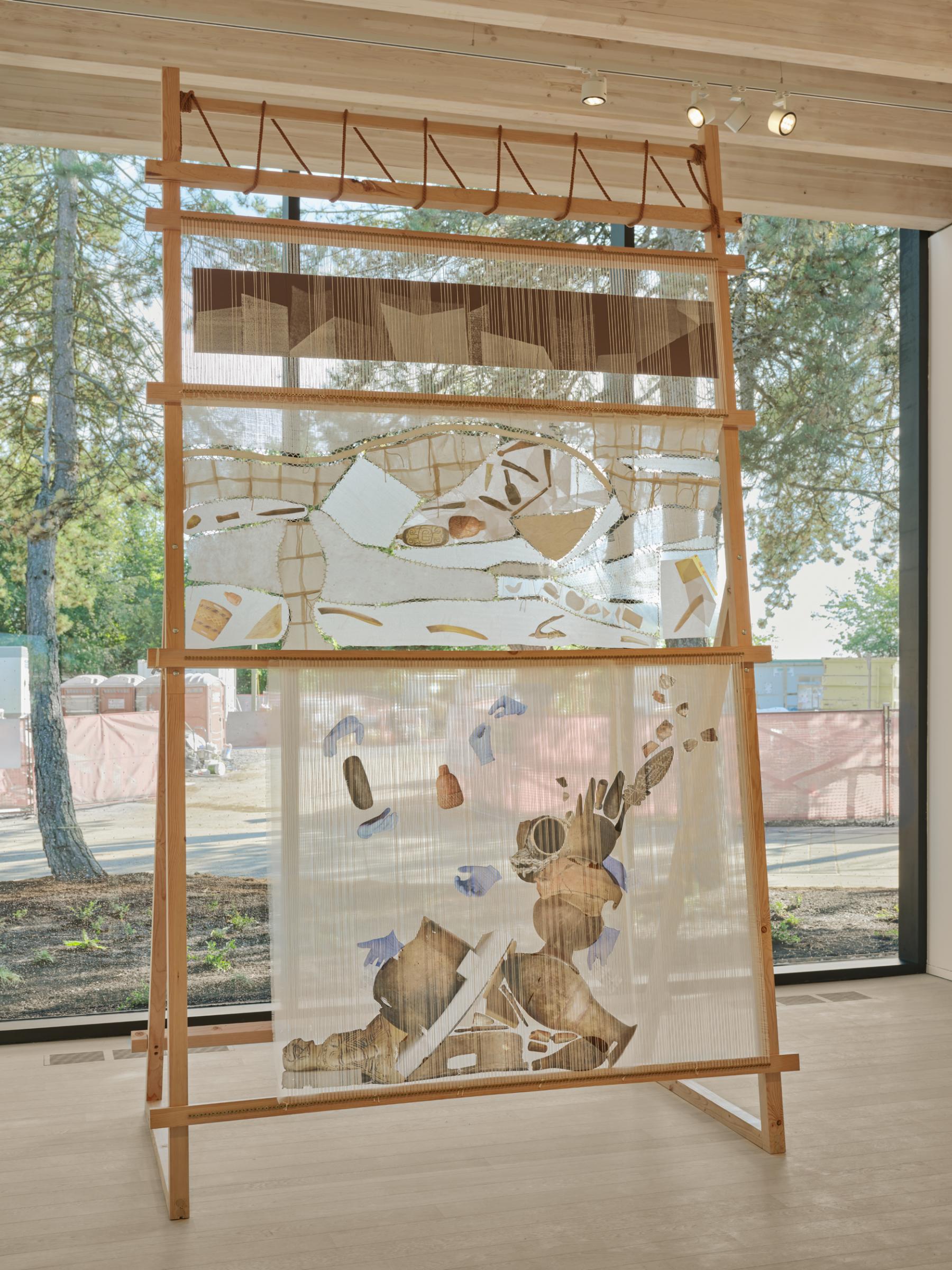A woven archive, as opposed to a taxonomical archive. Pushing relations between things, dissipating the edges and the boundaries between things in order to create interrelationships. Again, interbeing. So at SFU, my whole idea was to translate an archeology museum into a loom. What would that look like? Imagine all these objects migrating out of their very distinct cabinets and then going onto a loom and, like, what would that look like?