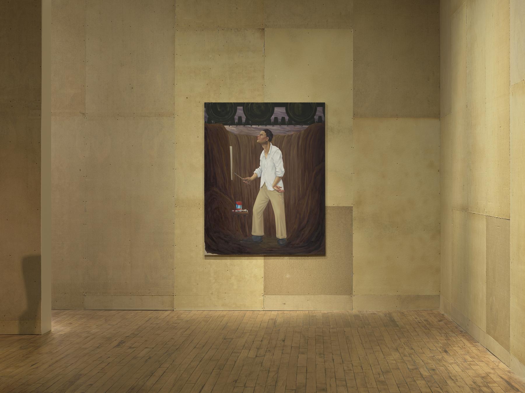 Most of my time is spent alone; I think that might be true for anyone who paints or writes. The figures you are referring to are both painters; both are a sort of self-portrait. One of them, in Fiddle V. Burns (2024), is in a hole in the ground, with treads of a tank on the ground above him. I was thinking, with this one, about the ditches soldiers sat in during World War I.