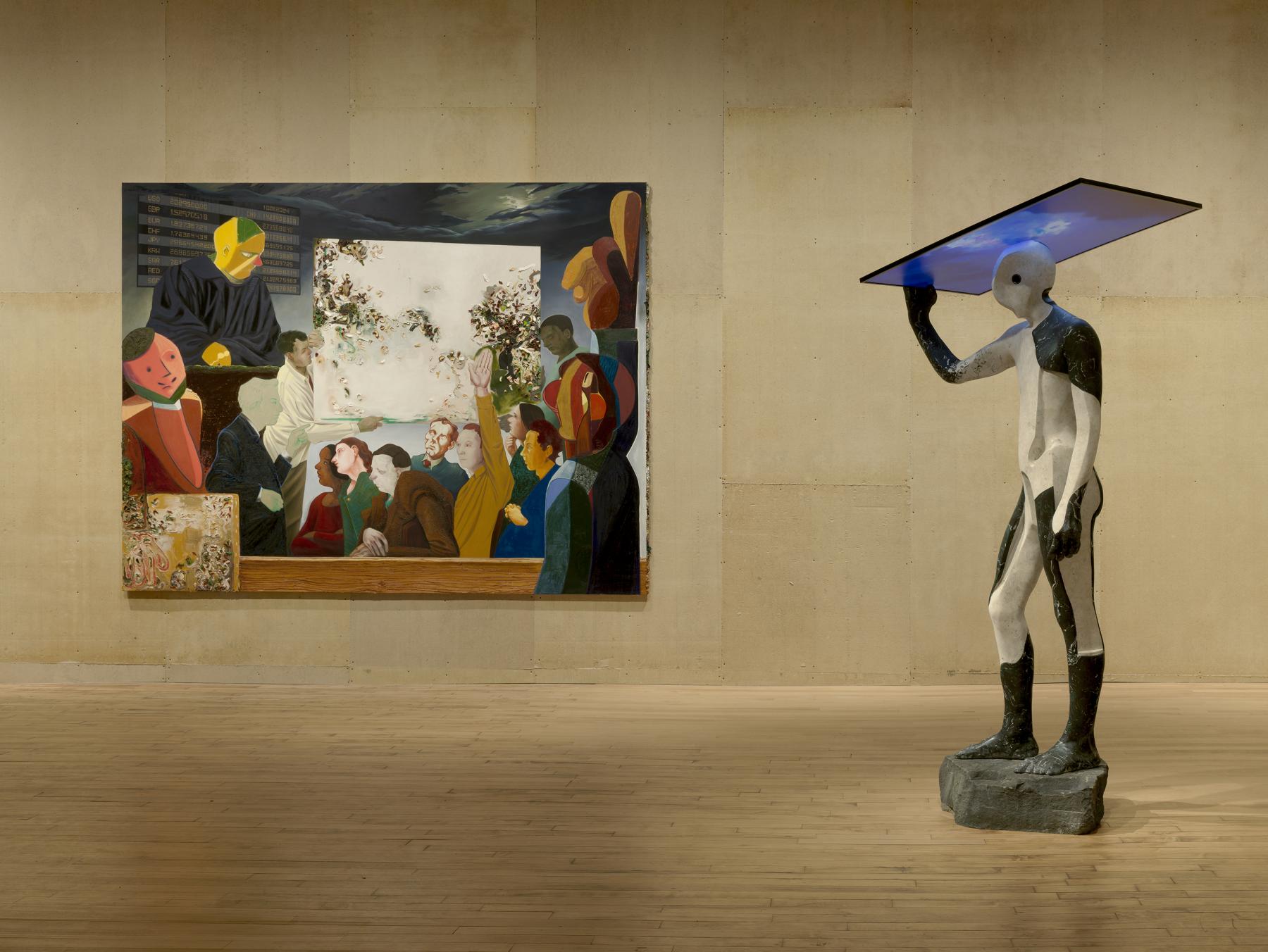 An auctioneer wearing the black gown of a judge sits stern-faced, between an international currency conversion table suspended in midair and a large abstract painting for sale. Above him, a foreboding night sky appears where one expects a ceiling. This is the scene of Nicole Eisenman’s The Auction (2025), where a painter is also present, clutching a similar looking canvas at his side. Positioned within the composition as if he had been called to testify, he’s rendered in flat Cubist color blocks, which make him gobsmacked—if not by the fact that he might be on trial than by the sight of an eager bidder before him whose hand is reaching way too high for anyone’s comfort, Sieg Heil style.