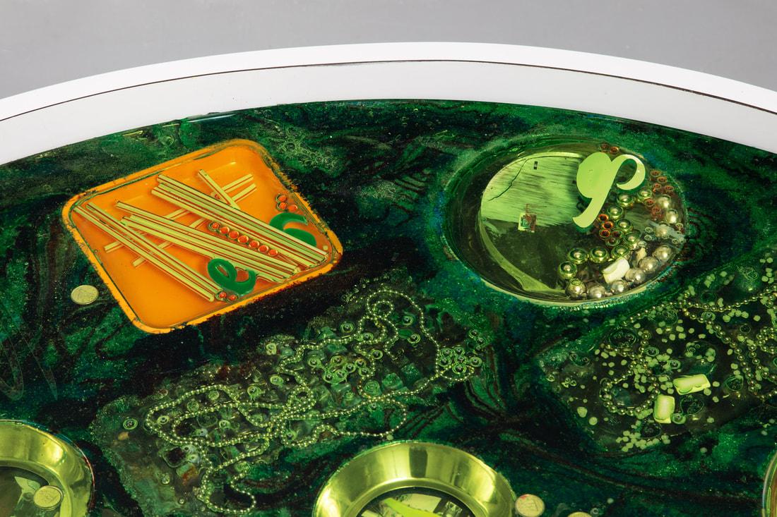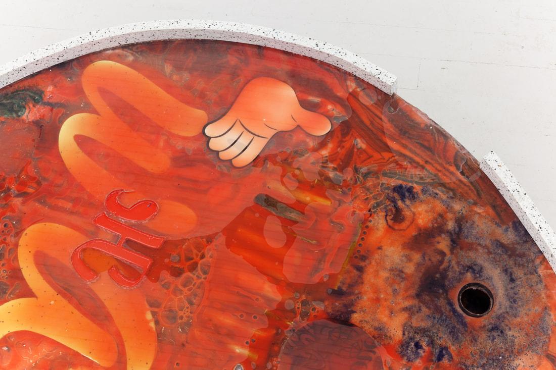 If Kevin Beasley’s sculptures from A view of a Landscape were largely concerned with countenancing historical narratives, reframing atavistic patterns from the 18th and 19th centuries to emphasize how they remain in place centuries on, Canadian sculptor Catherine Telford-Keogh’s work in the aspic genre reflects squarely on the perversities of contemporary, late-stage capitalism. And if the last essay explored Beasley’s symbolic suspension of exploitation, erasure, and decay, the works I’ll discuss here approach the crumbling worlds of contemporary capitalism by leaning into the encroachment of precarity or decay. Telford-Keogh’s work is largely defined by a flailing sculptural mode similar to those we’ve seen so far: perplexing, intractable wholes composed from anxious, interminable mixtures of unlike objects. This ethos holds across much of her practice, but the genre is most clearly embodied by a shapeshifting series of floor-mounted cylinders she has been producing for the past several years. Depending on the smaller series’ of which they’re a part, these objects have names like X LOWLIFE X, or The BaByliss Ultra Series institutionalized all forms of human function into low, flat intensities—titles that, in the latter case especially, mirror the sculptures’ frantic lists of constituent materials, which greatly outnumber Beasley’s already sprawling manifests. Once again, without erasing the meaningful distinctions between each individual work, we can identify the common tropes: each cylinder is roughly one foot tall and forty-two inches across; they appear to consist of a roughly inch-thick plastic shell, open at the top, scalloped at four points, and filled with a dizzying array of branded consumer objects, letters, image cut-outs, and foodstuffs, suspended and cast in what looks like a solid block of resin. Like so many aspics, they are each dyed bright, vibrant, murky colours, evoking images of bogs, swamps, stews, acids, fires, and plasmas.