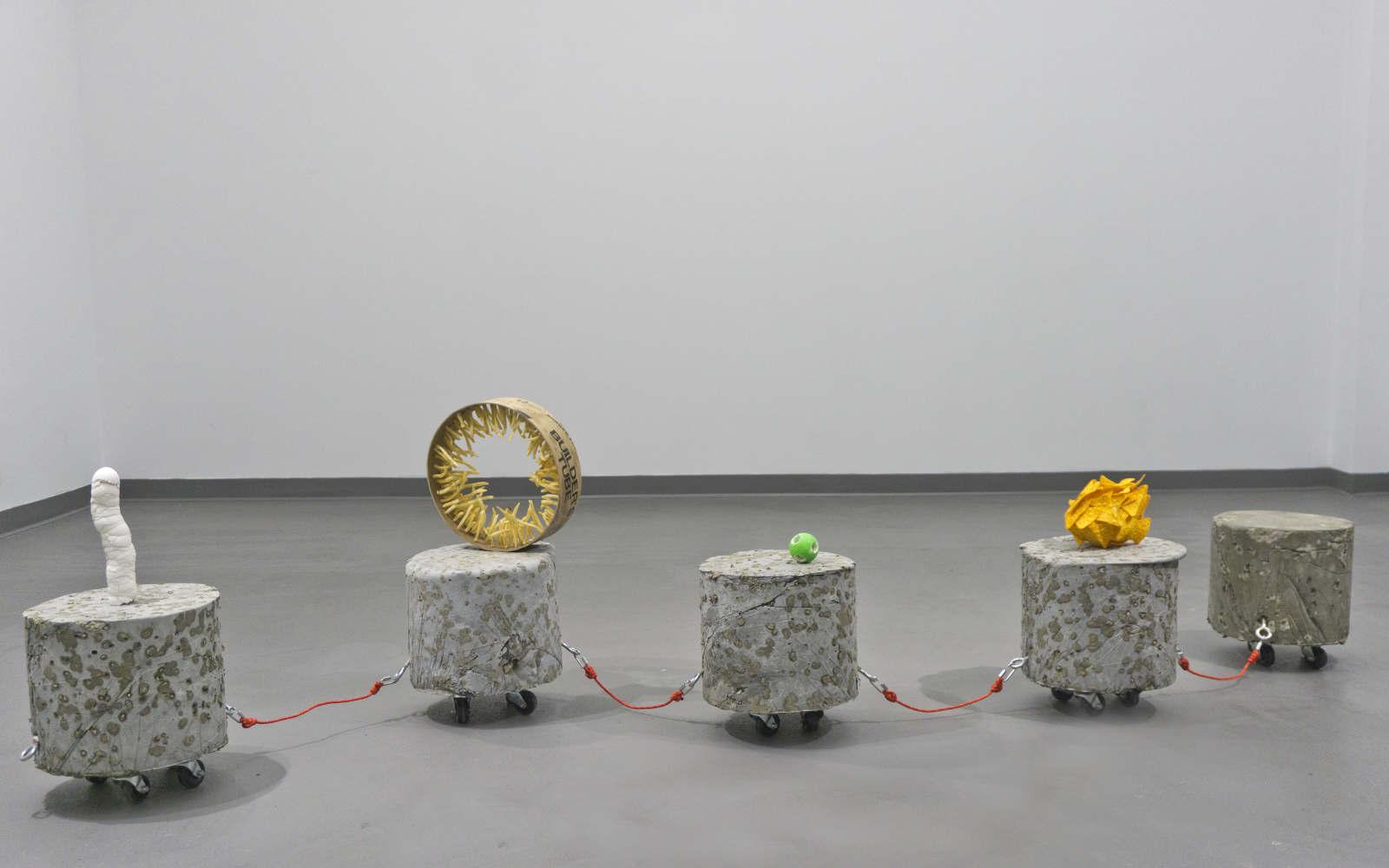 Daniel Griffin Hunt; An Awkward Age; From left to right, starting with concrete forms: Cooking Bloks | Recursive Function ( A Shell Supposes Form) | An Abstraction Congealing around Nothing | Jawbreaker Epoch or Hyper Mediation of Strata Form Constructed for Consumption | Goldgush; concrete, macaroni, Doritos, gobstopper, french fries, eggs, marshmallows, casters, rope, hardware; 2016. Photo by Daniel Griffin Hunt.