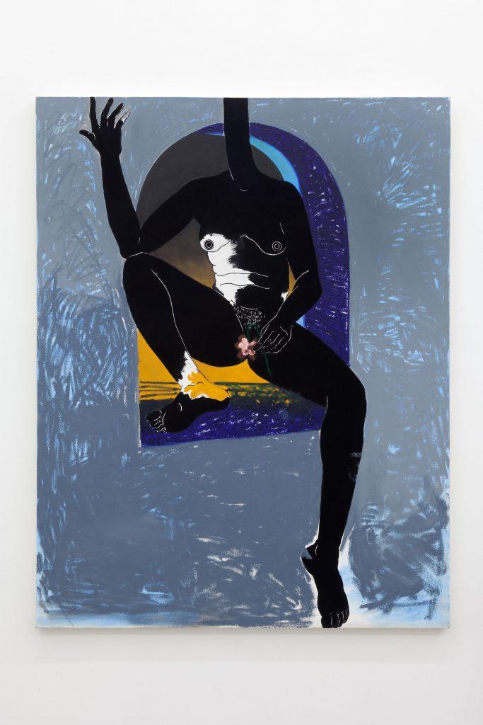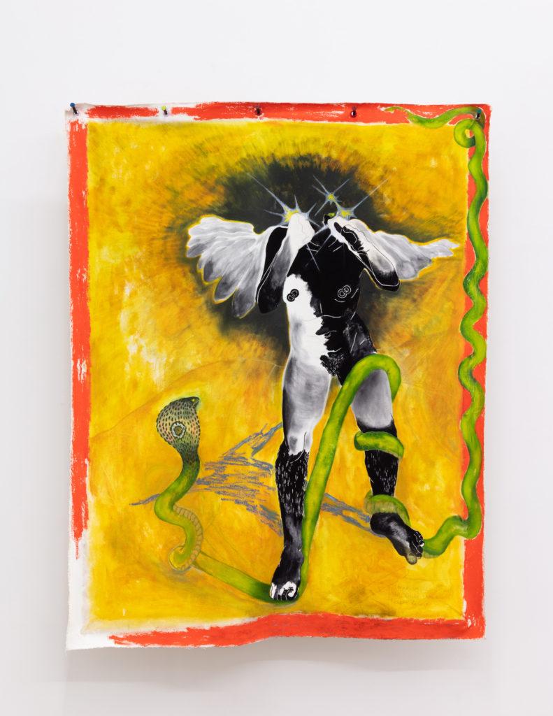 In another untitled painting from their Fantastic Passage show, they envisage a figure in motion, whose face is shrouded in both light and shadow, locked in fated struggle with a snake that enters the frame from the border to contort its body around the figure’s leg. On its back, a grim eye looks out at us. and we are confronted with our long, slow descent into ecological collapse. It seems the earth and all life on it turns itself against us and us against each other and we edge ourselves into war for the future. Here, we use our heel to crush the head of the serpent god of death that sought to tear our flesh from our bones. After, we find ourselves, under the dark side of the moon after the light has left us and most life has gone out of the room. We embrace our own death and must bear its weight that crushes our bones and distorts the body. It is the shadow to the left of us that no light can break apart. This is the end that brings the beginning.