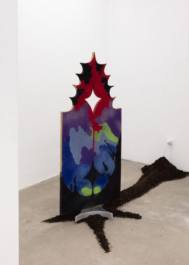 Oreka James’ Untitled 1 sculpture features fabric stretched over plywood fastened to a brushed aluminum anchor. The sculpture bursts out of star-shaped soil to come to a star-shaped point. The structure spins continuously, flashing between two abstract paintings that evoke the beginning of life. As the pulsing sound of the motor mimics the relentless tide of the ocean and fills the room, I am moved to a beginning when our life was first dreamed up and summoned out of primordial sea. I see the sun as it shines down and pulls earth up from out of the abyss and strikes it to make black Earth. Breaks the earth apart to give way to new life. As the evocative midnight purples meet life-bearing reds that then spill past James’ sky to meet earth, green life pulls through to give way to us. Before me, time and space break apart and I see that we were many things. Once we were birds the size of trees and trees who reached up, pressed into the tent of the endless sky and dared it to burst. In viewing James’ work I am told that we were also the spirits that moved them. Now, we make our life in the grave of all our lives from before. In life, we embrace the sky, the earth, the stars and all the waters that move upon the face of it. There was no boundary between time and space, life and death, creation and destruction. Under the protection of the open sky, we exist in the space between human and alien, alien and animal, animal and spirit and move boundless, formless over the face of Earth. But the prophets of death who betrayed the land and summoned our end and made us fear it. The fear demanded that we turn away from our own gaze, the one that affirmed our unity with all life, and direct it outwards. And this In search of safety, we adorn the place with the Gods we’ve made and make and make and make. In our feeble attempt to evade death, we make it and waste no time destroying the land, emptying the sea and replacing it with the things we’ve deemed undesirable and poisoning the air.