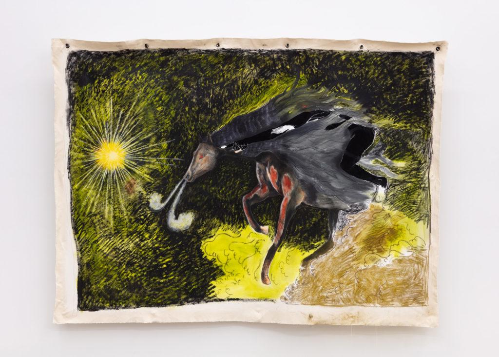 In haste, we join forces with non-human life to preserve what’s left of the end and embrace sacred union. Together, as in the scene from the other Untitled painting, on horse and in a cloud of smoke and ashes, eyes red with determination we race towards the Sun. We go up from the earth and enter the embrace of the effervescent blue of a sea. They, the knowing spirits among us, herald our second coming, our return from the edge of death, and remind us that we were never the vessel, only that which remains in it. The vessel is still the Black Earth that opens its soil and asks, declares and demands, that regardless of if the other sees you, you must see yourself and emerge from the place some call death. Outside, the omnipresent hum of the universe that moves over the face of the earth and brings us to face our shadow. After we no longer battle with the shadow of destruction, life brings us close, down to our knees on all fours and draws upon the commitment we made time upon time immemorial to care for all creation. We remember and we accept it in blood.