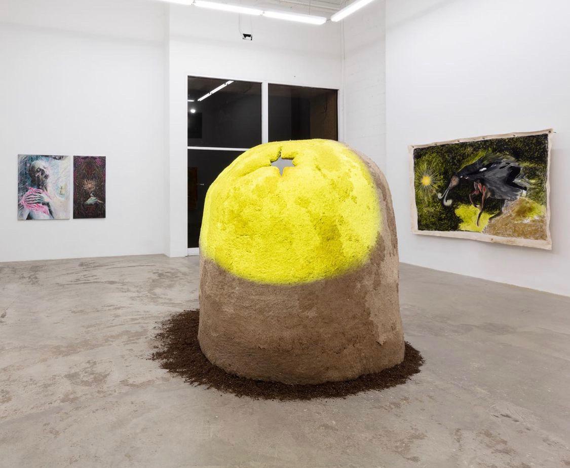 A home is forged out of the ground in the dome that is central to James’ work in Fantastic Passage. From the back of the papier-mâché, semi-circular dome, a neon yellow light shines through and lands on the ground before me in the shape of James’ signature star burst. When I stare into the light before me, a whisper cuts through the hum of the universe and folds into time, into space, and births new creation, summons new faith. The millennia after, we make ourselves new Gods and sacrifice the Gods of old that fed us death and destruction. We make ourselves again out of the soil to which we return, and pronounce ourselves holy, made over now in the image of our one true God. The prophets among us tell of a world broken apart by irreverence and has still come back together a million times over. They sing from the tops of the very trees that we once were, and still are, and say our world is still with us and there is still much left. Every beginning necessitates an end. Inside of us bubbles up the question – do you still know God? When we gaze upon the face of the water and the water gazes back, it asks only once – do you see yourself? In the case the other does not see you, what do you become?