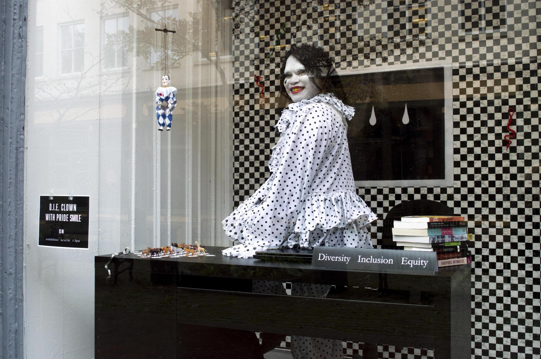 The second window is an office space that includes the same checkered background but has a painting placed on top instead. The painting depicts a black square with large size white teardrops in the middle. On the glass, there is a sign that reads “D.I.E Clown with Pride Smile.” The acronym stands for Diversity, Inclusivity and Equity. Garay performs as a clown wearing a black and white costume - made by fashion designer Ethan Hull - in the fictitious office. They sit in their cubicle, fulfilling their duties while showing a grin that reveals their rainbow-coloured teeth. There are three screens on the last window, different sizes, playing a looping animation in which a person is diving into a portable pool, where “WHITE TEARS” is written on the water. Breach! is packed with references of how the artists, using humour, refuse to be complacent. Even in a place they considered a second home, they will not be showpieces in this pretend meritocracy.