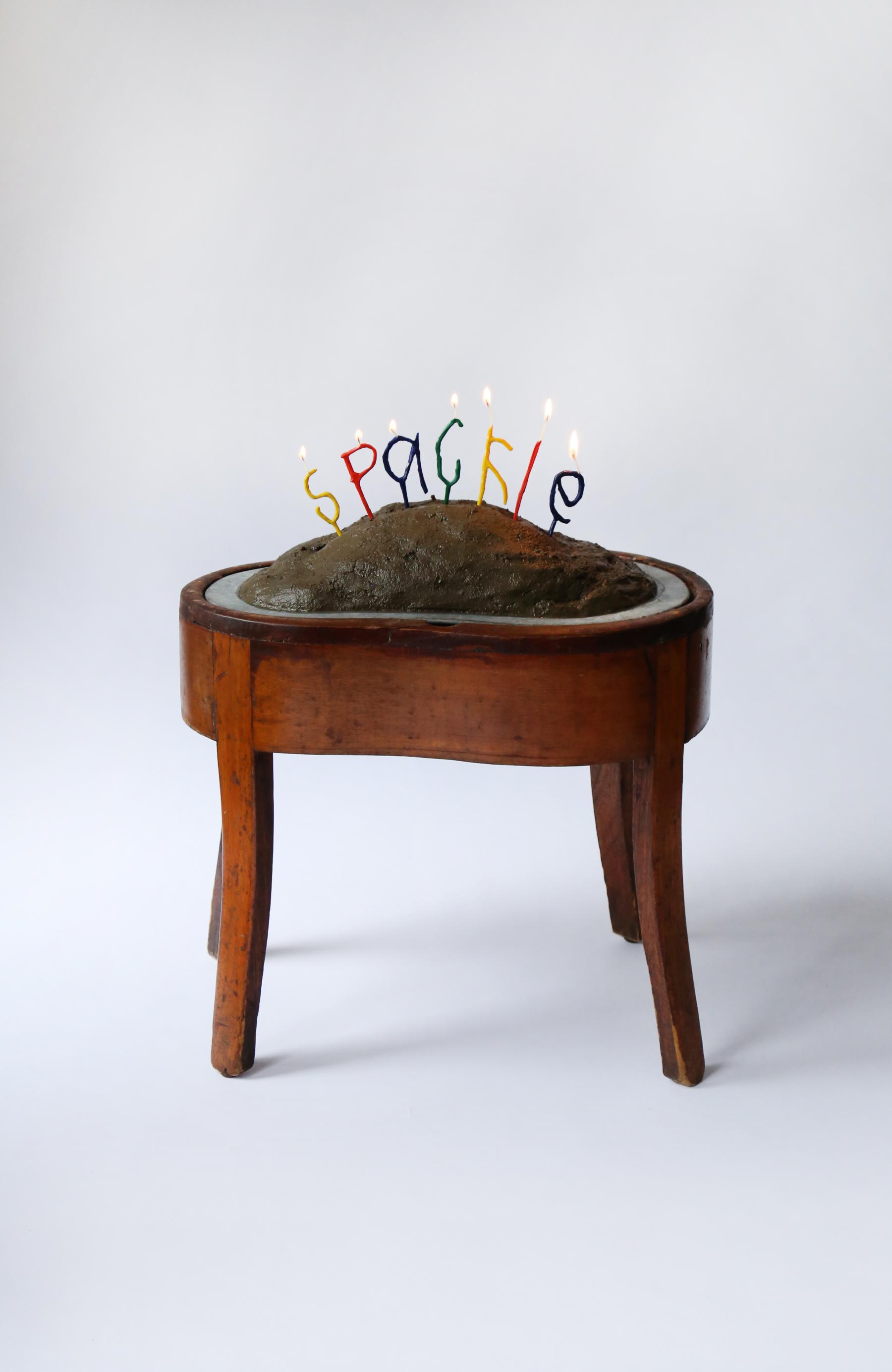 Beyond Birthday Mud Pie, antique commode, mud, crayon wax, wicks, flame, 25 x 18 x 13".