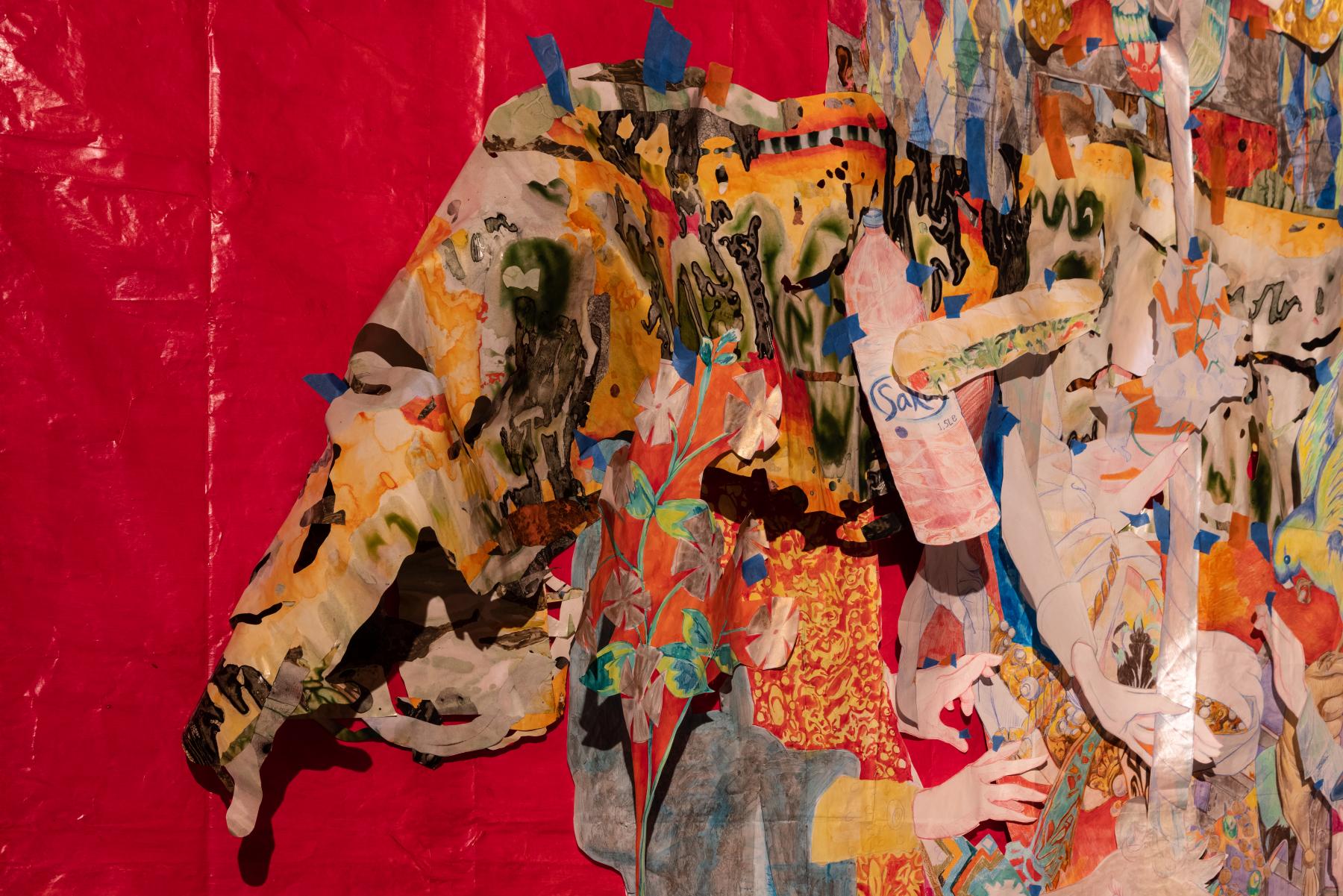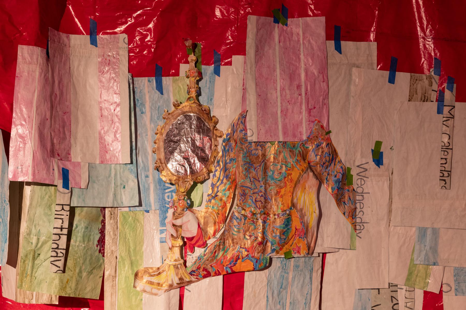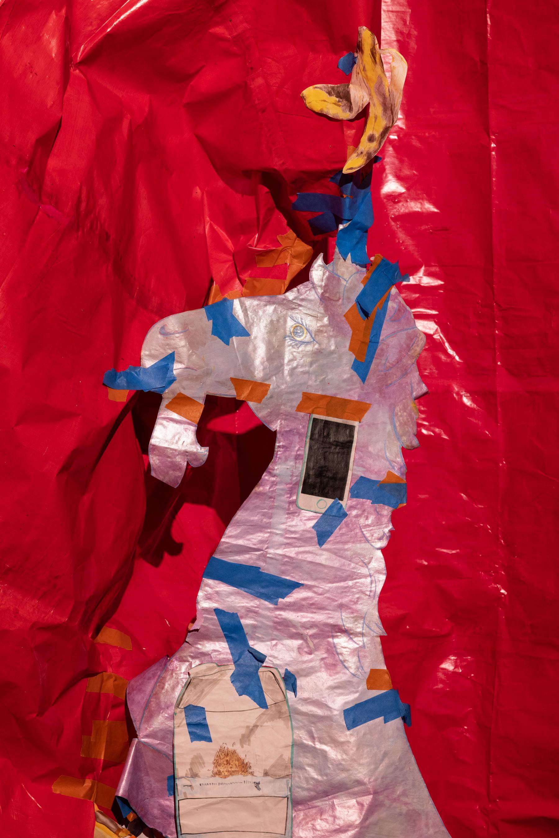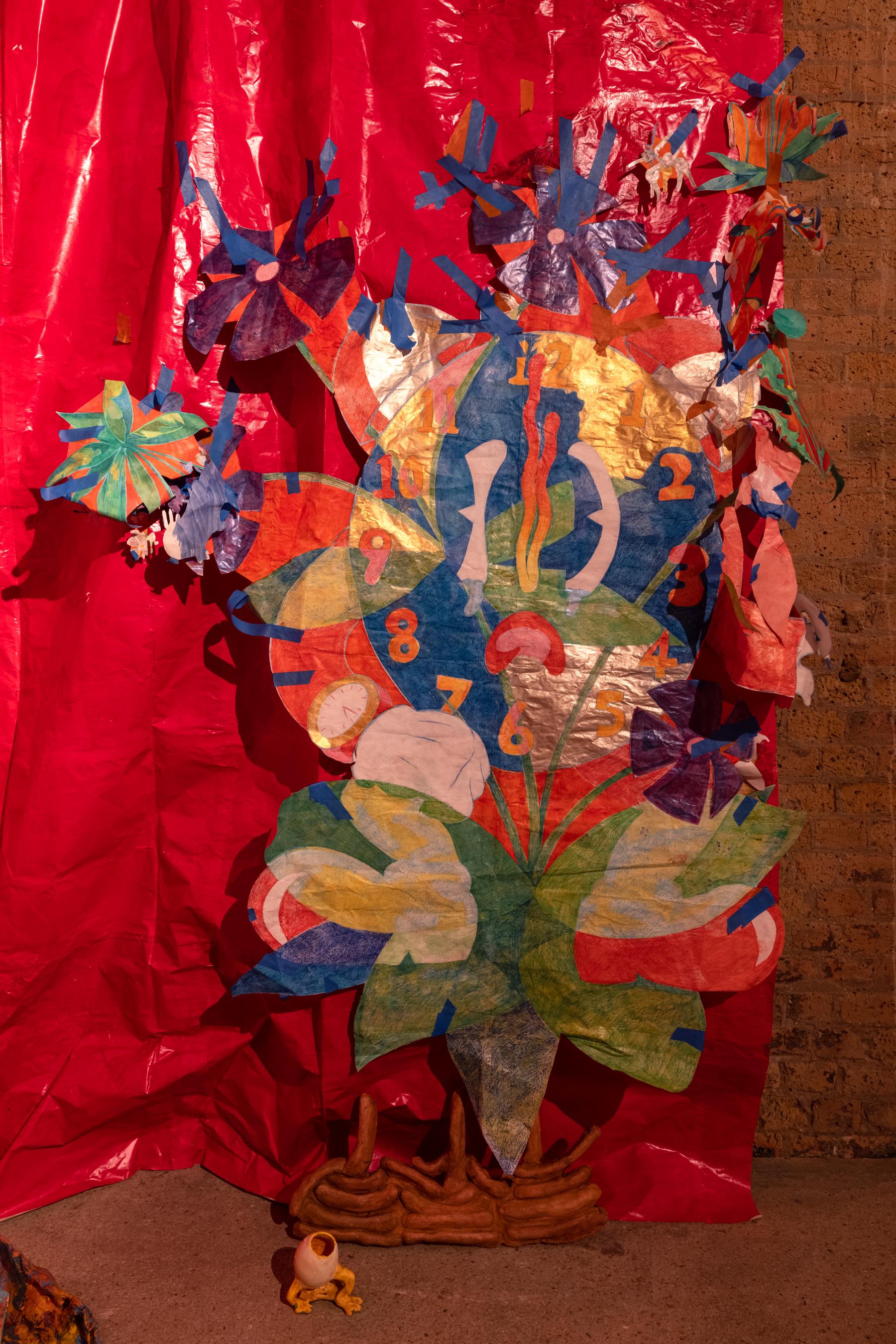 The border agents are now rifling through Keogh’s luggage, scrutinizing the value of the art object along an x-axis of suspicion and a y-axis of incredulity. “What the fuck is that?” the Clock asks. “It’s a big Microsoft Teams calendar with the days cut out. I was thinking of making it into a kind of trellis for the flowers,” Keogh replies. This exchange somehow initiates a spike in the Earth’s gravity. Keogh now lies supine and offers, “Some people say that the red flag of socialism originated in Merthyr Tydfil in 1831 when one of the rebels dipped a white banner in pig’s blood.” The Clock slurs: “I cannn ffeeelll tthheee grraaavvviiittational ttiiimmmee diiillaaatttiion.” The red paper curtains are both backdrop and horizon, socialist past and communist future upon which the collages move. The aesthetics of anti-work merge, in a planetary sense, with the aesthetics of time. Everywhere the masking tape underscores the provisional status of the ensemble, easily taken down and rearranged because it’s barely held together. Keogh has redrawn the anarchist sab cat to remind us how precarious workers can mobilize in a crisis, while the tape retains some traces of the manual labour baked into the installation. UK customs concretizes the boundary conditions of Keogh’s art, requiring these crumpled images to navigate a background of border violence and geopolitical arbitrage. “Oink, oink, oink. May I open the bag sir?”