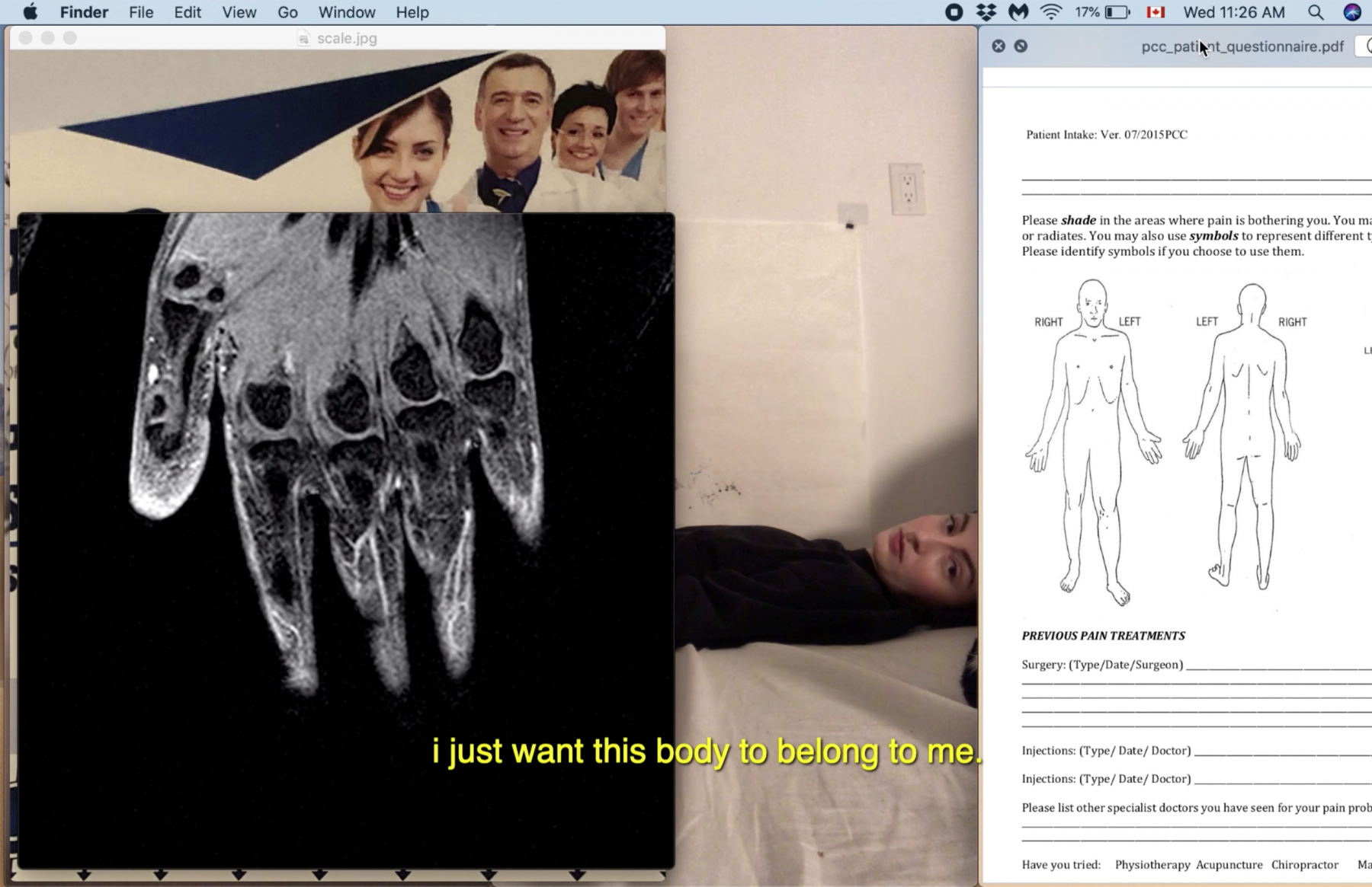 Hannah Bullock is a visual artist and writer based in Toronto. Her work explores her lived experience with chronic pain, through printmaking, video, sculpture, drawing, performance and writing. As part of a poetic essay video 2020-09-16 at 11:19:28 AM, Hannah’s voice calmly and firmly recites, “I can’t stop my immune system from failing me from time to time or maybe I could if I took better care of myself. But it’s hard to take care of yourself when your own body doesn't take care of you.” With this work, Hannah draws you into an intimate space of her personal computer desktop and her own world of grappling with chronic pain, the medical system, and her own theorizations around illness.