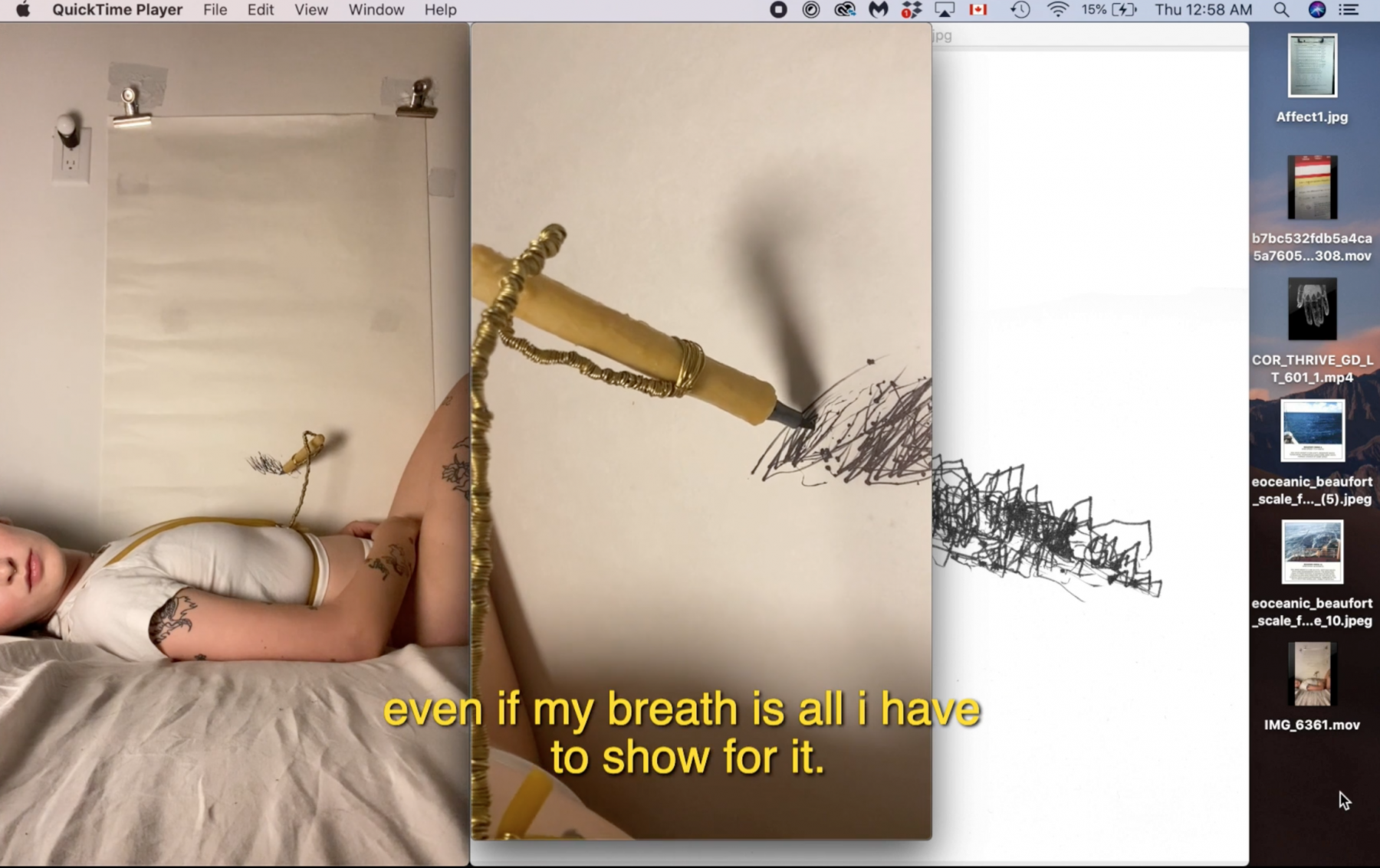 I was so nervous about making a work that used my writing in this way. Listening to your own voice is hard as fuck [Laughs]. I actually first thought of using desktop recording in our summer course (which was focused on writing). It was all on zoom so I was trying to think of a way to share visuals that referenced the piece of writing I was reading in a way where I wouldn’t have to pull everything up while I was talking. So I just made a desktop recording of me pulling up all the visuals I wanted to share, somewhat in line with the pacing of the writing. It essentially started as a way to calm my nerves for a presentation and avoid the added pressure of multitasking. But it also felt like a really simple way to contextualize the work I was doing, while playing further into this idea of vulnerability. Maybe it’s just me, but every time I have to screen share I feel so exposed. Like suddenly I feel very naked and concerned that something extremely embarrassing or incriminating will be on display. And I think having this video of me sharing my desktop screen, and playing videos of me breathing/drawing in bed, and showing my medical records felt like a way to let the viewer into my private physical space—but also my private digital space. Both the digital space of my laptop and the physical space of my bed have become really essential to my work as tools that make my practice more accessible to me, and I think to the viewer as well.
