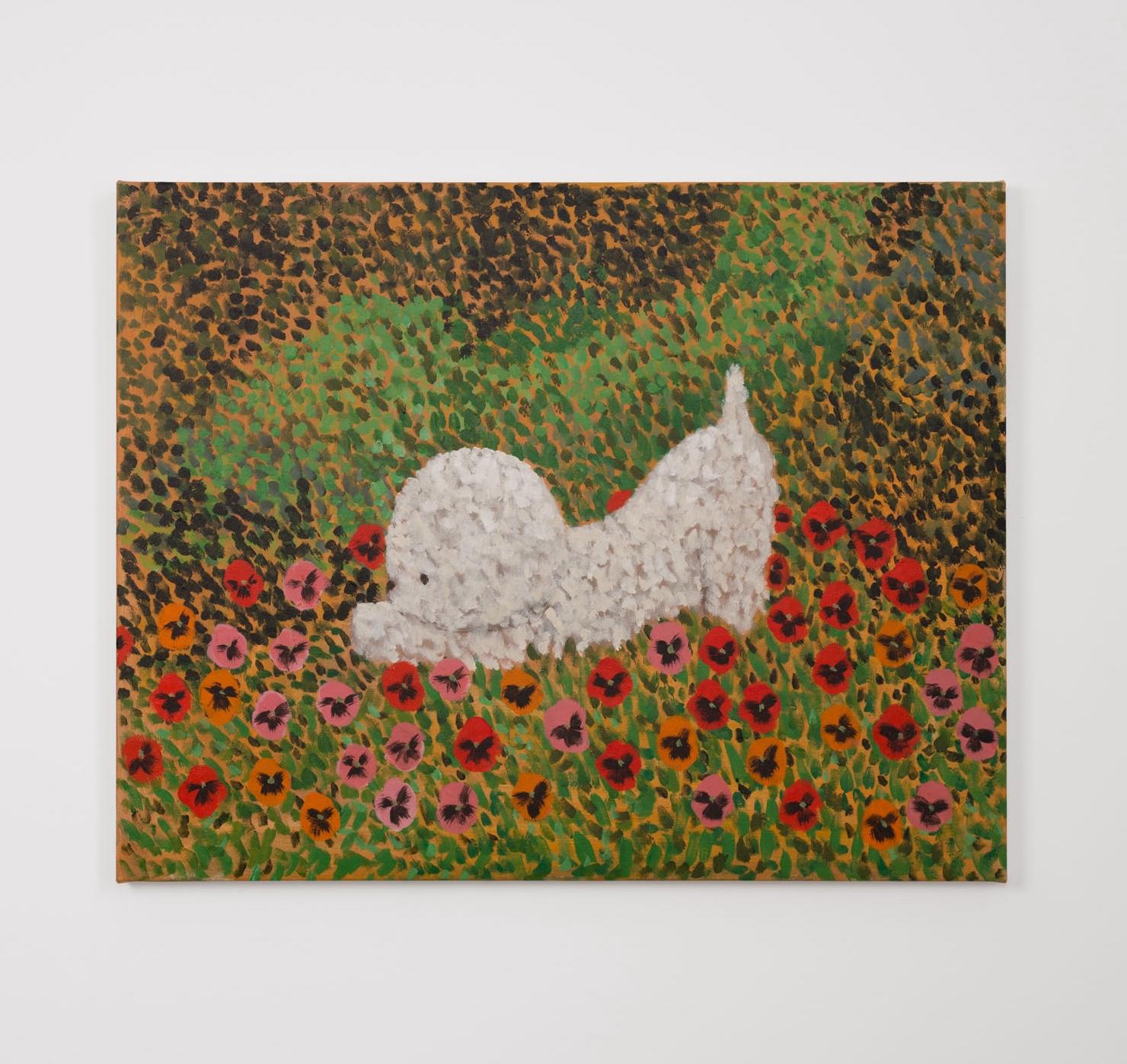 Claire Milbrath, Dog in Pansies, 2024, Acrylic on canvas, 22 x 28 inches