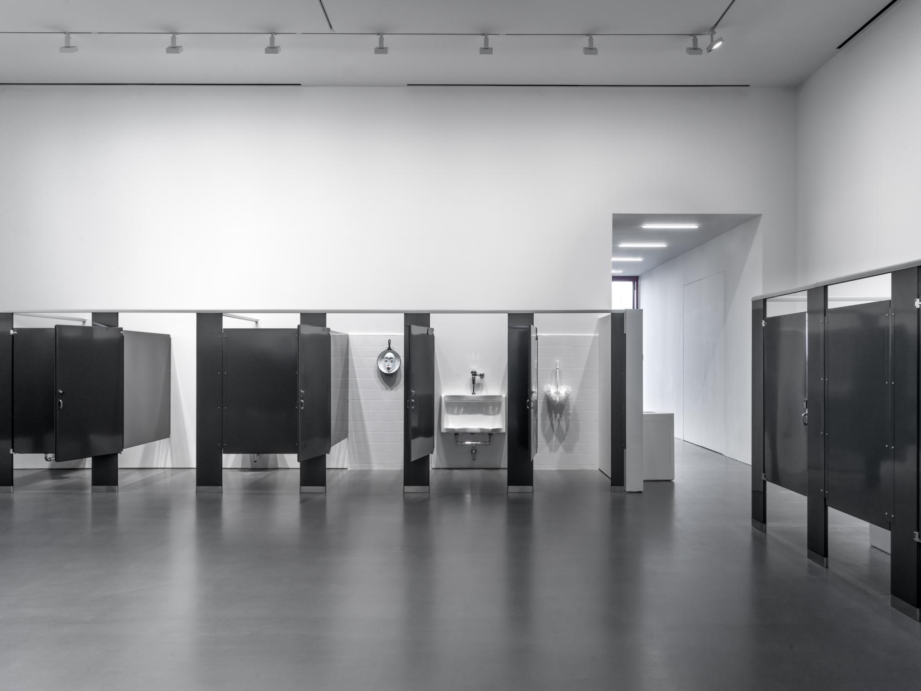 A gallery employee-cum-bathroom attendant invited visitors to use two functional urinals in defiance of conventional gallery etiquette. Regardless of whether a particular visitor took up this offer—a gendered offer—the invitation encouraged a heightened sense of bodily awareness. Behind one door, a urinal situated low to the ground was lined with a mirror that would double a stream of urine, heightening the spectacularity of the mundane act. Across the room, Hayden paid homage to Robert Gober with a custom double-wide urinal that encourages two (or more) users to share a stall in a dramatic reversal of partitions intended to separate same-sex users. By positioning the urinals inside the partitions, when these fixtures are typically situated in the open, Hayden invites considering the gendered implications of stalls as feminized sites of relative privacy according to binary conventions of gender.