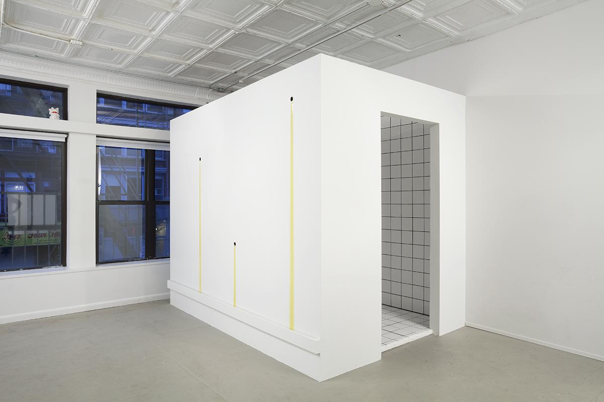 Yi plays upon the spatial dynamics of containment in Auras, Orgasms and Nervous Peaches (2011), a white, ceilingless structure lined with white tile. The gridded interior heightens the claustrophobia of the already restricted space, which is reminiscent of a commercial kitchen, an interrogation cell, a hospital room, a cubicle, and a public toilet—all regulatory sites of white patriarchal authority which shaped Modern sanitary protocols persisting today. Each tile is a white cube within the white cube that is the architectural installation within the white cube that is the modernist archetype of the gallery as an aesthetic enclave, a sort of vacuum or bubble somehow separate from the wider world. The overwhelming whiteness of this structure, which evokes what historian Fabiola López-Durán terms the “clinical agenda of architectural modernism,” prompts reckoning with the ideological underpinnings of the gallery—in its pervasive whiteness—as a non-neutral space.