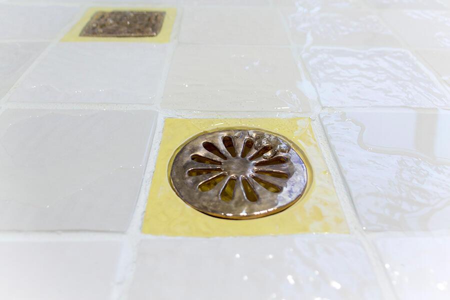 Where Yi compromises the grid through leakage, Cathy Lu undermines the grid through tactility. The California-based artist hand-pressed porcelain tiles in shades of off-white, tan, and yellow to form the basin of Drains (2022), a shallow sink-like installation. Subtle indentations in the glazed squares recall the embodied process of sculpting, indexing the labor of the artist and her assistants. The receptacle includes twelve painted porcelain drains modeled after ornate covers that Lu found while visiting Jingdaezhen, the famed Chinese ceramics hub. Through these decorative drains—which contrast the norm in the United States, where austerity reigns and grates are typically designed to disappear—Lu underscores the cultural and historical contingency of the design of sanitaryware.6