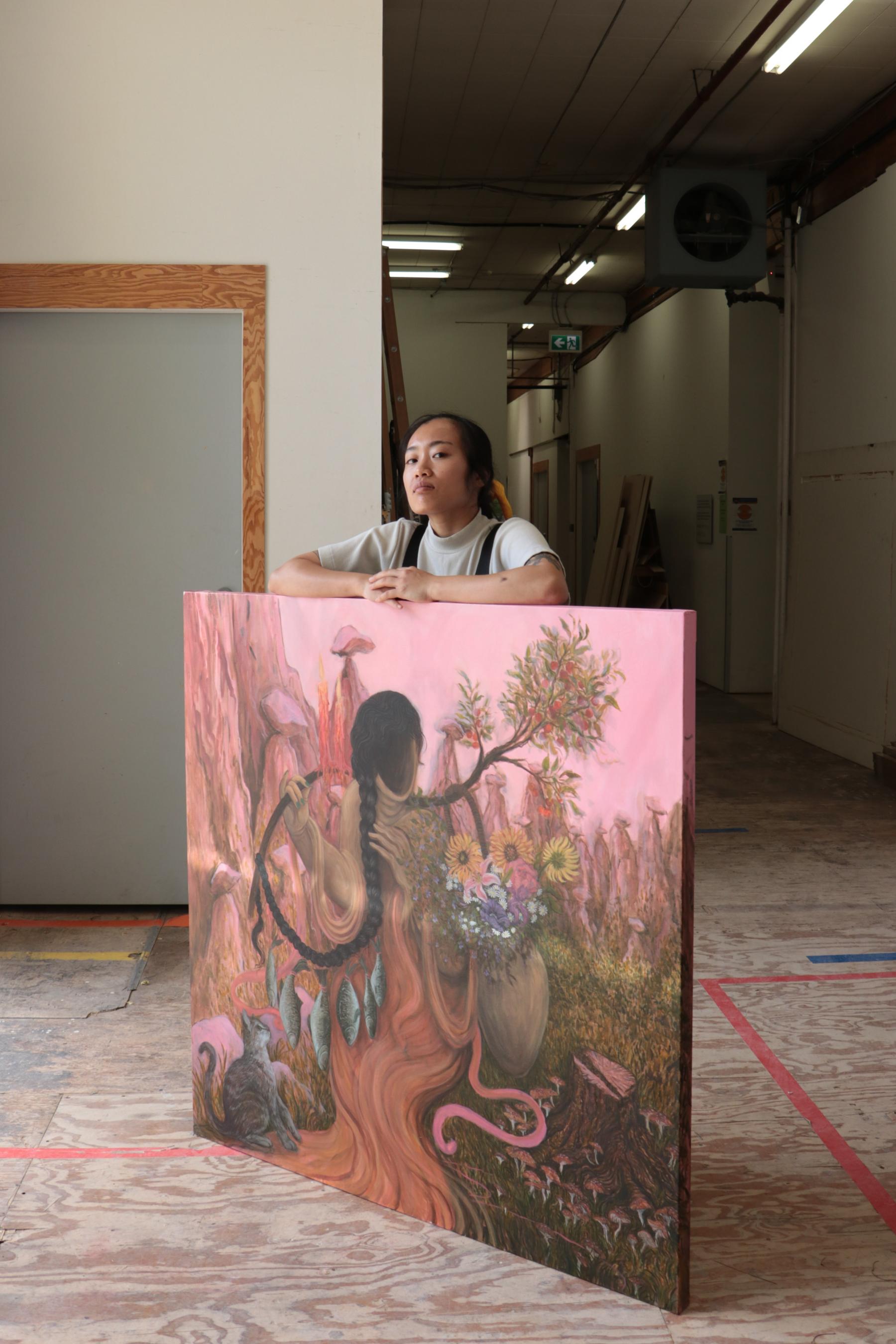 Michelle Nguyen’s artwork will enworld* you. Monstrous vegetation joins with naked, dripping, feminine bodies who live ferociously without ever doing too much. Figures pour from one orifice into another and commune with anthropomorphic meat. Colours push out towards the viewer. In the world of the painting, bodies, surfaces, paints, and textures party, seeming to want the viewer to become involved. Her work is luxurious, a little foreboding, and streaked with absurdity. Across her many mediums, drawing, print, clay, and largely in paint, Nguyen shows how the abject is cased in potential, still radiating beauty.