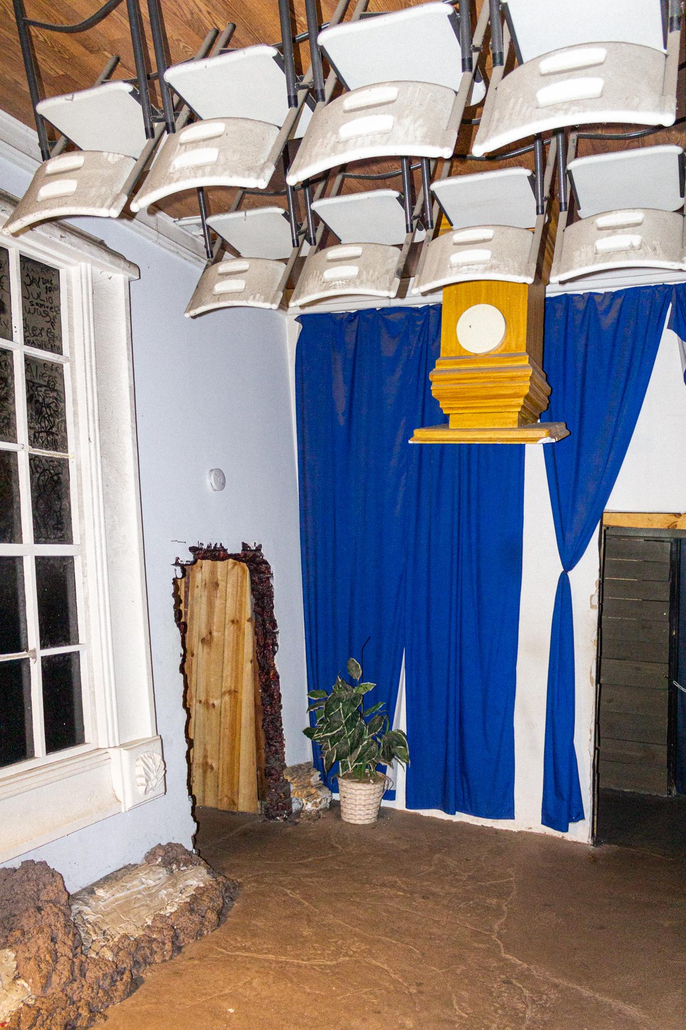 I move to the next room where I’m greeted by a cardboard cutout of Barack Obama, his face slashed. I’m relieved to find the Donald Trump cutout similarly defaced—at least the slashing was bipartisan. The room leads to a hallway where the building’s orientation abruptly flips and the ground becomes the ceiling. In the Oval Office a mannequin with a powdered wig stands behind a desk, resembling a bat hanging by its feet. The press briefing room’s podium is similarly suspended before twelve plastic chairs covered in dust and handprints, presumably from past visitors sitting on each other's shoulders, looking to leave their mark.