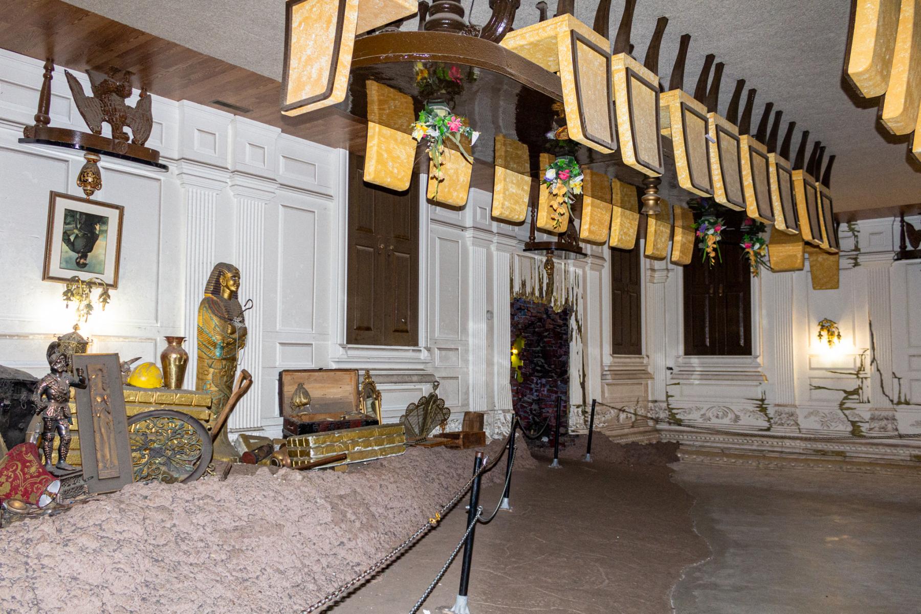 From here on, the attraction’s architects have abandoned any attempt at creating an earnest reproduction of the monument, and the remainder of the tour traverses a hodgepodge of conspiracy theories. A laboratory containing the remains of aliens salvaged from the Roswell incident precedes a corridor lined with wooden crates, each neatly labeled: “Lunar Landing Props,” “Yeti Evidence,” “Amelia Earhart’s Logbook.” As the crates pile up, the Upside-Down White House morphs into a showroom of quaint conspiracies Americans might joke about around the kitchen table, while avoiding mention of the countless theories undermining our society at present; that, among others, Democrats rigged the 2020 election and are operating a child abduction ring in order to perform Satanic rituals. The tour avoids the latter, but traffics in the same fundamental belief: that the nation’s darkest secrets hide in its marble halls, waiting for you to expose them.