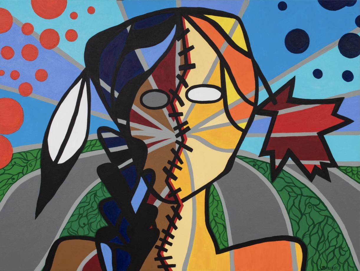 John Brady McDonald, She Wears The Scars Of Your Canada - Reconciliation, (named by Rosanna Deerchild), 2019. Acrylic on canvas, 30" x 40." Sourced via.